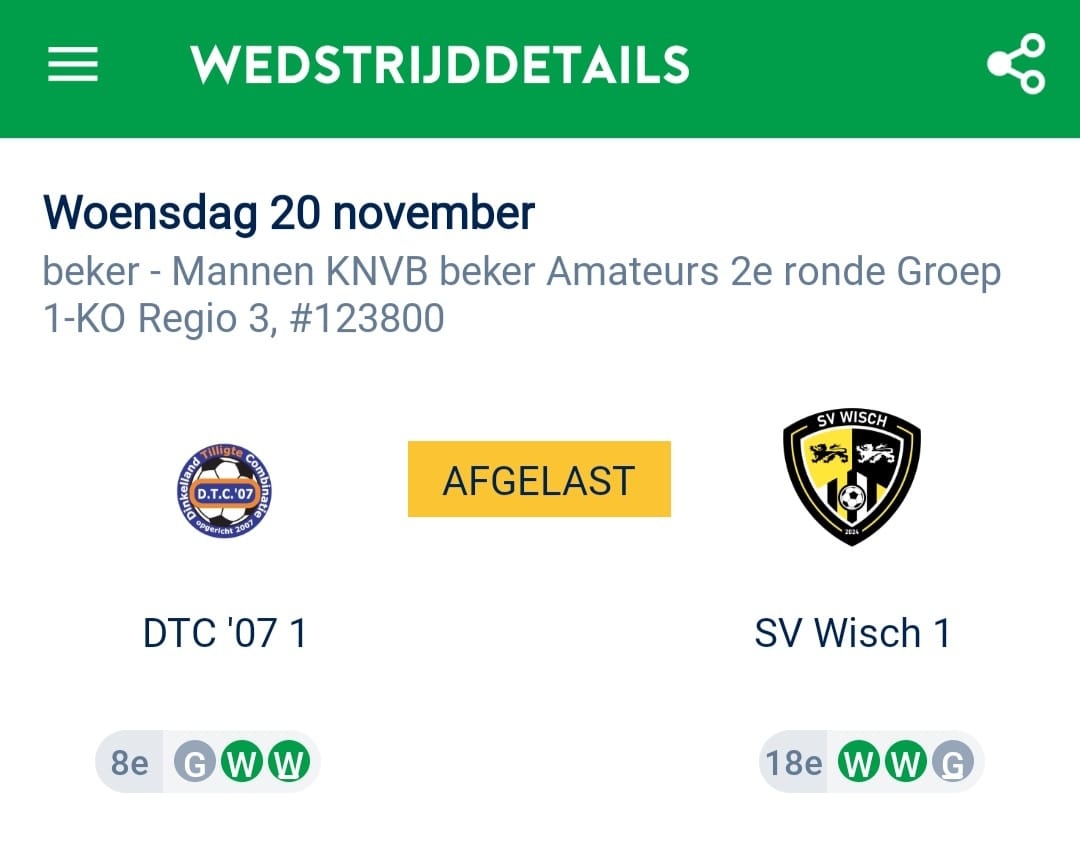 De wedstrijd tussen DTC '07 1 en SV Wisch 1 van woensdagavond 20 november om 20.00 uur is vanwege een sterfgeval binnen de vereniging afgelast. Deze wordt op een later moment weer ingepland door de KNVB.